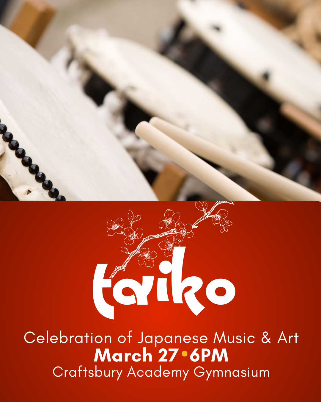 Join us for a Celebration of Japanese Music and Art on Thursday, March 27, at 6 p.m., in the Craftsbury Academy World War II Memorial Gymnasium. Craftsbury students will perform Taiko drumming and Japanese folk dance. Student artwork using traditional Japanese methods will be displayed. Families and community members are invited to join us! To learn more about the Taiko artist residency at Craftsbury Schools from March 17-27, visit: https://craftsbury.ossu.org/contentItem/7c367562-80de-4d43-b750-bb6ab50833ec/1586265739.