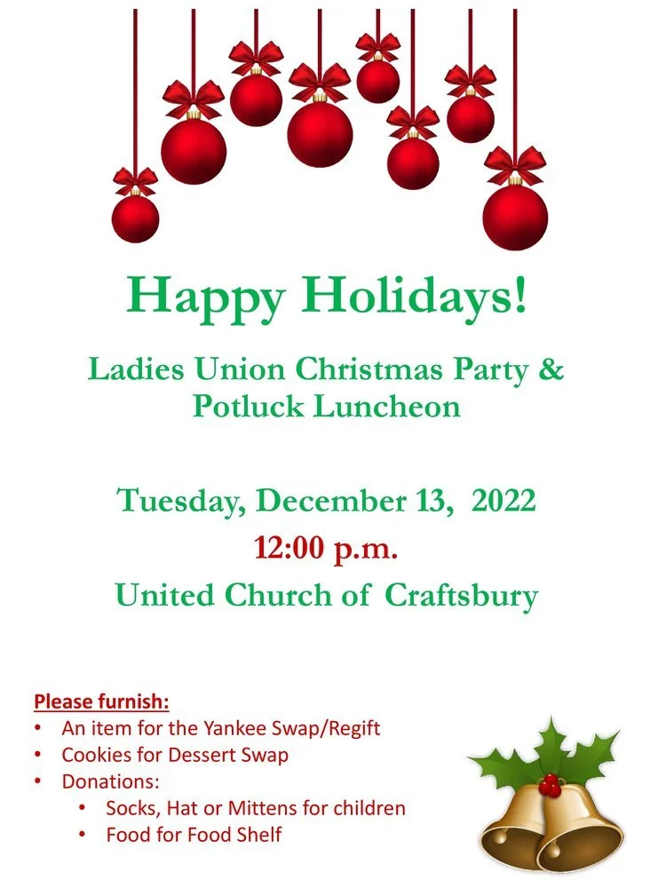 Ladies Union at UCC Tuesday, December 13, 2022 12:00 PM 2:00 PM 12:00 14:00 United Church of Craftsbury 7 Church Lane Craftsbury Common, VT 05827 (map) Google Calendar ICS <- Go Back to Craftsbury Calendar of Events